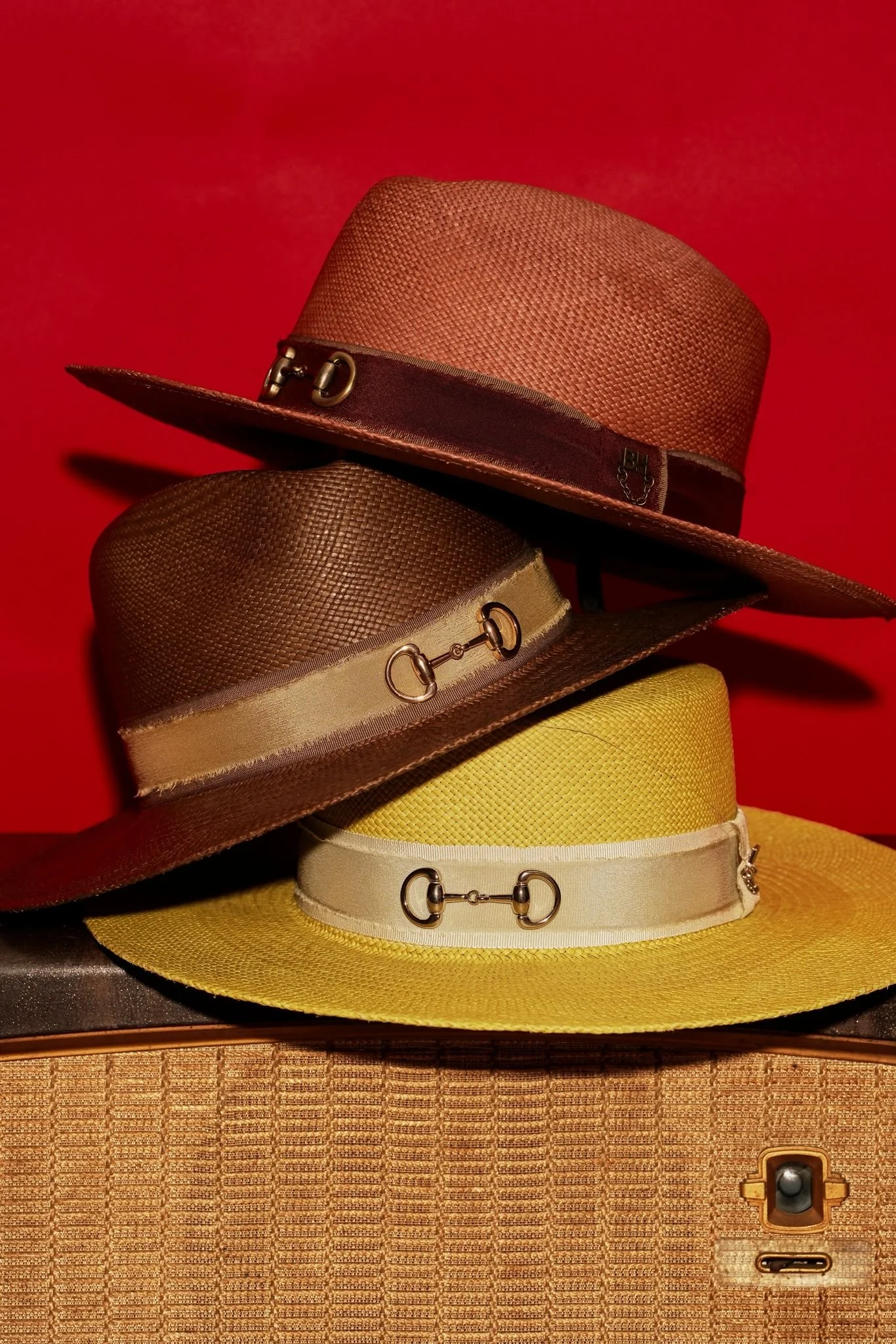 Trim: Wide olive-beige grosgrain ribbon band, finished with a gold horsebit detail (metal hardware)